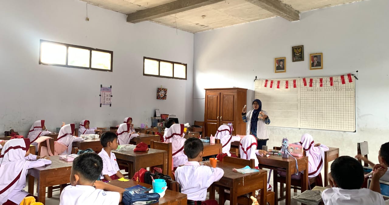 Dokter gigi drg. Lelly Yustri Anita, ibu dari siswa kelas 1, mengajarkan cara menjaga kesehatan gigi secara interaktif dengan praktik menggosok gigi.