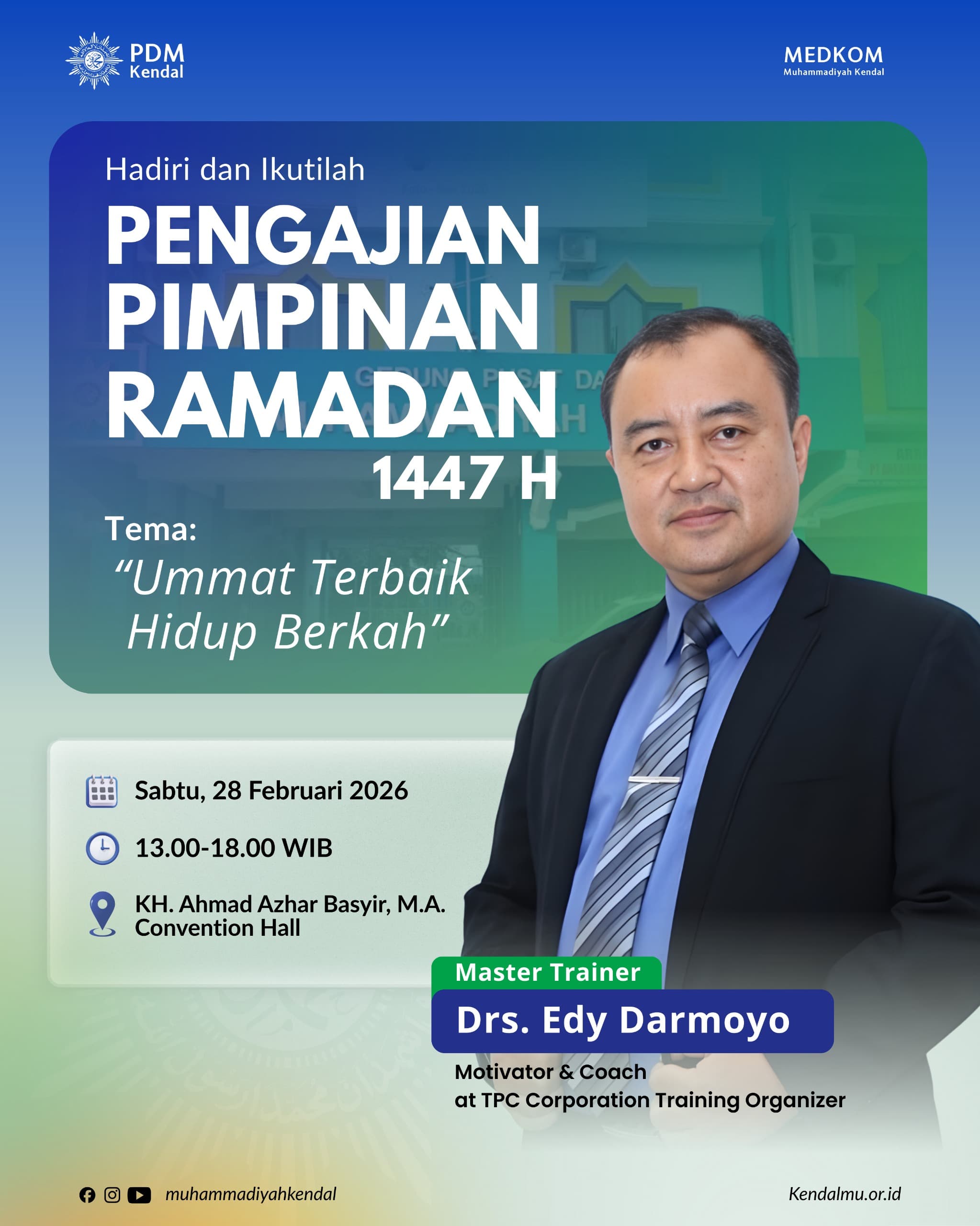 KENDALKENDALMU.OR.ID – Pimpinan Daerah Muhammadiyah (PDM) Kendal melalui Majelis Tabligh akan menggelar Pengajian Pimpinan Ramadan 1447 H pada Sabtu, 28 Februari 2026, pukul 13.00–18.00 WIB di KH Ahmad Azhar Basyir, M.A. Convention Hall RSI Kendal.