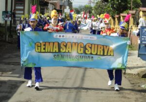Dentuman drum band Gema Sang Surya dari SD Muhammadiyah Sukorejo semakin memeriahkan suasana pawai yang berlangsung tertib dan penuh antusiasme.
