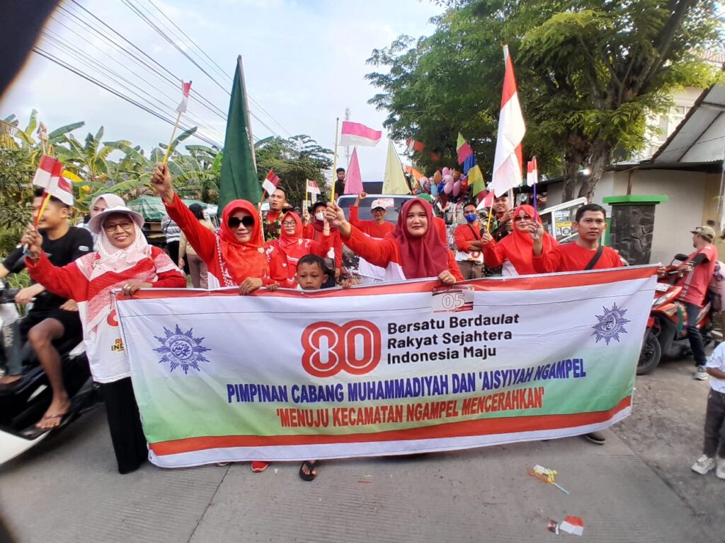 NGAMPEL,KENDALMU.OR.ID – Pimpinan Cabang Muhammadiyah (PCM) dan Pimpinan Cabang ‘Aisyiyah (PCA) Ngampel, Kabupaten Kendal, turut ambil bagian dalam Karnaval HUT ke-80 Republik Indonesia yang diselenggarakan Pemerintah Kecamatan Ngampel, melalui Panitia Karnaval dan Pawai Pembangunan, Rabu siang (20/8/2025).